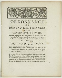 (SEINE-ET-MARNE) SEIGNEURIE D’AIGREFIN, À NEUFMOUTIERS EN BRIE. « Ordonnance des Bureau des Finances de la Généralité de PARIS, portant suppression & changement de chemin dans la Seigneurie d’AIGREFIN, paroisse de NEUFMOUTIERS EN BRIE. du...