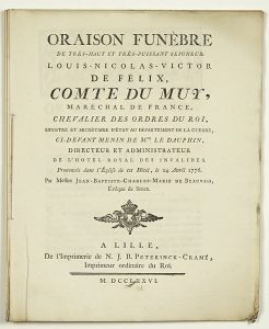 “ORAISON FUNÈBRE de Louis-Nicolas-Victor DE FÉLIX Comte de MUY, Maréchal de France, Ministre de la Guerre, Ci-devant Menin de Mgr le Dauphin, Directeur et Administrateur de l’Hôtel Royal des Invalides., prononcé le 24 Avril 1776 par Messire...
