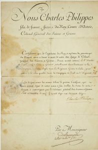 CHARLES X (Comte d’ARTOIS, Versailles 1757 - 1836) Roi de France 1824 à 1830 - Pièce signée CHARLES PHILIPPE Fils de France, Frère du Roy, Comte d’ARTOIS, Colonel-Général des SUISSES & GRISONS (En-tête impr.) - Fait à VERSAILLES le 9...