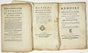 ─ « Manière de faire LE PAIN DE POMMES DE TERRE, sans mélange de farine, par M. PARMENTIER, pensionnaire de l’Hôtel des Invalides, Censeur royal, Membre du Collège de Pharmacie de Paris, de l’Académie des Sciences de Rouen & de celle de Lyon, Démonstrateur d’Histoire Naturelle. » Imprimerie Royale. 1779; 48pp in-8°