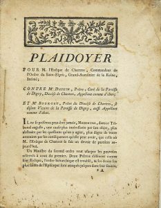 « Plaidoyer pour M. l’Evêque de CHARTRES, commandeur de l’Ordre du Saint-Esprit, Grand-aumônier de la Reine, Intimé ; contre Me DAGUIN, prêtre, curé de la Paroisse de DIGNY, Diocèse de Chartres, appelant comme d’abus ; et Me BOURGET, prêtre du Diocèse de Chartres, se disant Vicaire de la Paroisse de DIGNY, aussi appelant comme d’abus. » -