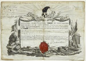 Un drapeau phrygien remplace la Couronne et un Sceau de cire de la République Française masque le Blason aux armes de MONTBAREY.