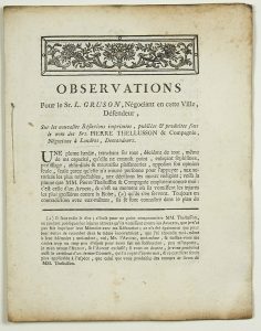 (LILLE (59). LONDRES.) « OBSERVATIONS pour le Sr L. GRUSON, Négociant en cette Ville (LILLE), défenseur, sur les nouvelles Réflexions imprimées, publiées & produites sous le nom des Srs. PIERRE THELLUSSON & Compagnie, Négociants de LONDRES,...