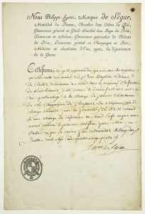 – Pièce Signée « Le Mal de SÉGUR » à son entête gravé en tant que Maréchal de France, Gouverneur général et Grand Sénéchal des pays de FOIX, DONNEZAN et ANDORRE, Gouverneur particulier du château de FOIX, Lieutenant Général en Champagne et Brie, Ministre de la Guerre. Certificat fait à Versailles le 22 Juillet 1784 –