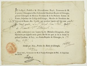 Inspecteur du Collège de Chirurgie (Son En-tête imp.) & de 2 Prévôts de l’école - Certificat de présence à mes leçons sur les Maladies Chirurgicales, & les Opérations par lesquelles on les guérit, délivré au Sieur Joseph René SALÉ -