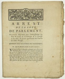 VAL D’OISE. SARCELLES. 1784. « Arrest de la Cour de Parlement, portant Règlement pour l’administration des biens & revenus de la Fabrique de la Paroisse de SARCELLES, & de ceux qui appartenant aux Pauvres de ladite Paroisse. » Fait en...