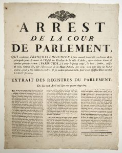 « Arrest de la Cour de Parlement de PARIS, qui condamne François LHIAUDIER à faire amende honorable au-devant de la principale porte & entrée de l’Église des Récollets de la Ville d’ARDES (Duché de Mercoeur ;