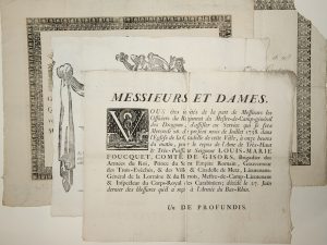 ─ « Messieurs et Dames, vous êtes invités de la part de Messieurs les Officiers du Régiment de Mestre-de-Camp-général des Dragons, d’assister au Service qui se fera Mercredi 26 Juillet 1758 dans l’Église de la Citadelle de la Ville, pour le repos de l’Âme de Très-Haut et Très-Puissant Seigneur Louis Marie FOUCQUET.