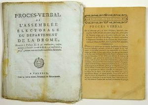 ─ (CONVOCATION DES ASSEMBLEES ÉLECTORALES) - “Procès-Verbal de l’Assemblée Électorale du Département de la DRÔME, séante à VALENCE dès le 20 vendémiaire, conformément à l’article 1er de la loi du 1er vendémiaire an 4°, portant convocation des assemblées électorales. - Imp. à Valence chez la veuve Aurel, Imprimeur du Départ. 36pp in-4° - (Liste nominative des électeurs de tous les Cantons, suit les séances du 20 au 27 vendémiaire an 4) - Vignette - Bandeau - (petit manque de papier au verso, page blanche.)