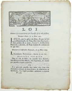 BLOIS (LOIR-ET-CHER) – « LOI relative à la circonscription des Paroisses de la Ville de BLOIS » - Donnée à Paris le 25 Mars 1791 – Bandeau décoratif – Impr. à CHARTRES, chez Fr. Durand ; 3pp in-4° -
