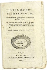« Discours de M. MIRABEAU L’Ainé, sur l’égalité des partages dans les successions en ligne directe, Lu, une heure après sa mort, par M. TALLEYRAND-PÉRIGORD, Ancien Evêque d’AUTUN, à la Séance de l’Assemblée Nationale du 2 Avril 1791 –