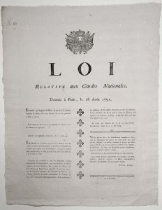 « LOUIS (XVI) par la Grâce de Dieu & par la Loi constitutionnel de l’État, Roi des Français. Décret de l’Assemblée Nationale di 1er Août 1791. Le Ministre de la Guerre est autorisé à donner tous les ordres nécessaires pour compléter l’organisation des Gardes Nationales, pour opérer leur rassemblement, & pour les porter dans tous les lieux où elles peuvent être utiles à la sûreté & à la défense de l’État. »