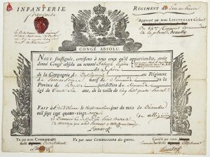 ILE D’OLÉRON (17). ST DOMINGUE. RÉGIMENT DU PORT AU PRINCE Infanterie. CONGÉ MILITAIRE absolu pour Joseph LEFÈVRE de la Compagnie de Desliguères au Régiment du PORT-AU-PRINCE, natif de Simande, province de Bresse, fait à L’ISLE D’OLÉRON...