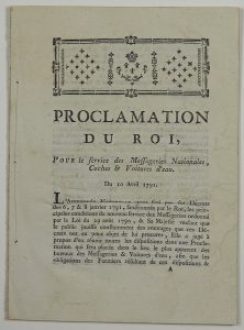 (COCHES & VOITURES D’EAU. 1791) « Proclamation du Roi, pour le Service des MESSAGERIES NATIONALES, COCHES & VOITURES D’EAU. » - du 10 avril 1791 – Impr. à MONTPELLIER, de l’Impr. de Jean MARTEL, 1791 ; 16pp in-4°.