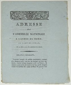 (LA FAYETTE) CAMP DE SEDAN 20 Août 1792 – “Adresse de l’Assemblée Nationale à l’Armée du NORD, au Camp de SEDAN, du 20 août 1792.” - Imprimé 8pp in-4° - bandeau -