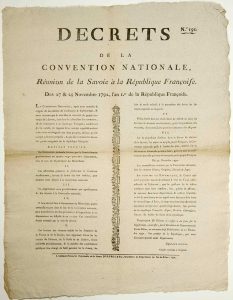 « dès ce moment LA SAVOIE fait partie intégrante de la république Française… LA SAVOIE formera provisoirement un 84ème Département, sous le nom de DÉPARTEMENT DU MONT-BLANC… ».