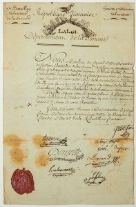 DÉPARTEMENT DE LA SOMME. Pièce signée du Conseil du 7° Bataillon des VOLONTAIRES NATIONAUX DE LA SOMME - Nomination de Jean Baptiste DELATTE, élu à la majorité des suffrages, CAPITAINE de la 6° Compagnie. - Fait à BERGUES en Flandre le 15...