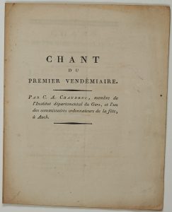 GERS. « CHANT du Premier Vendémiaire. Par C. A. CHAUDRUC, Membre de l’Institut départemental du Gers, et l’un des commissaires ordonnateurs de la fêtes à AUCH ; Musique du Chant du Départ. » - (Allusion au Combat d’Algésiras (Espagne)...