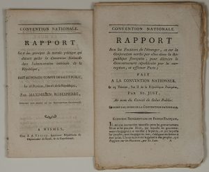 ─ « Rapport sur les principes de morale politique qui doivent guider la Convention Nationale dans l’administration intérieure de la République, fait au nom du Comité de salut Public, le 18 Pluviôse an 2 (6 février 1794), par Maximilien ROBESPIERRE, imprimé par ordre de la Convention Nationale. – Impr. à NÎMES, chez J.A. TEXIER, Imprimeur Républicain du département du GARD, & du Représentant. 39 pages in-8° (dérelié)