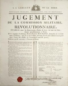 « JUGEMENT DE LA COMMISSION MILITAIRE RÉVOLUTIONNAIRE, établie pour les Départements D’INDRE-ET-LOIRE, LOIR-ET-CHER, séante provisoirement à TOURS, qui acquitte & décharge Marie-Jeanne RICHARD, domiciliée de la Commune de GLENAY, agée de 17 ans & demi, prévenue d’avoir pris volontairement parti dans l’Armée des Rebelles, de l’accusation conr’elle portée ; Ordonne qu’elle sera mise en liberté. (Accusé d’avoir suivi les rebelles dans toutes leurs marches, & de ne s’être sauvée, qu’à l’époque où ils ont été mis en déroute au Mans, par les Républicains.)