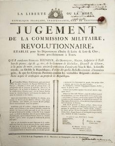 « JUGEMENT DE LA COMMISSION MILITAIRE RÉVOLUTIONNAIRE, établie pour les Départements D’INDRE-ET-LOIRE, LOIR-ET-CHER, séante provisoirement à TOURS, qui condamne François BEUNEUX, Maçon salpêtrier & Tailleur de pierres, âgé de 43 ans, de la Commune de RICHELIEU, District de Chinon, à la peine de mort, comme atteint & convaincu d’avoir crié « Vive le Roi, la famille Royale, au Diable la République » ; d’avoir dit que les Rebelles étaient d’honnêtes gens, & que les citoyens Patriotes étaient les véritables Brigands : déclare biens acquis & confisqués au profit de la République. »