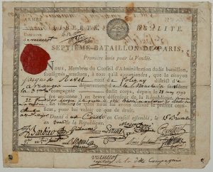 (GUERRE DE VENDÉE) “1ÈRE LEVÉE POUR LA VENDÉE. 7° BATAILLON DE PARIS.” Certificat militaire pour Jacques REVEL natif de Foligny (FOLLIGNY /MANCHE) qui a servi dans la 3° Compagnie dudit Corps en brave défenseur de la République jusqu’au...