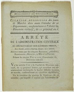 « Fixation définitive des Jours de Marchés dans toute l’étendue du Département, conformément à l’arrêté du Directoire Exécutif, du 14 Germinal an 6 – Listes des 43 Communes, avec le nombre de Marché par Décade, et le Jour auxquels ils sont fixés. –