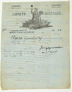 (Maréchal BRUNE. VIGNETTE.) « BRUNE Général en chef de l’Armée D’ITALIE » (du 4 avril au 31 oct 1798) - Brouillon d’une lettre adressée au Premier Consul sur GAP et EMBRUN - Grande vignette gravée BRUNE Général en Chef de l’Armée...