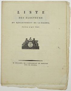 MARNE – « LISTE DES ÉLECTEURS du Département de la Marne, pour l’an 7. » (1799) – Impr. à CHALONS, de l’Imprimerie de Mercier, rue de brebis ; 14 pages in-4° - Vignette « La Loi et Le Roi. » -