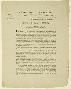 ARMÉE DE L’OUEST. MORBIHAN. Ordre du jour du Général en Chef BRUNE (Futur Maréchal) fait au quartier-général de VANNES, le 19 pluviôse An 8 (8 Fév. 1800). Impr. à VANNES, chez J.M. Galles ; 2pp in-4°.