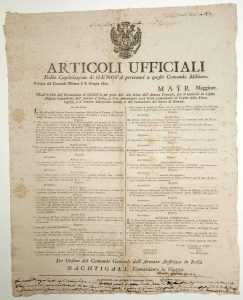 Articles officielles de la Capitulation de Gènes (GENOVA). Bologne, le Commandant Militaire, 8 juin 1800. Traité de l’évacuation de Gènes entre l’armée Française représenté par MASSÉNA Commandant l’Armée d’Italie et le Vice-amiral Lord KEITH Commandant la Flotte anglaise, et le Lieutenant Major Baron d’OTT, commandant le Blocus de Gènes. (Texte en Italien.).