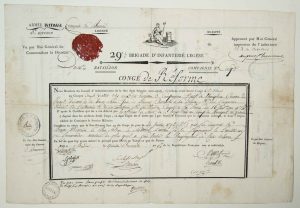 « ARMÉE FRANÇAISE EN BATAVIE ». Congé militaire de la 29e ½ Brigade d’Infanterie Légère, signés des Généraux Pierre Antoine DUPONT-CHAUMONT et Jean Nicolas RAZOUT (Comte de l’Empire), fait à BRÉDA (Pays-Bas) le 4 Brumaire An 9 (26...