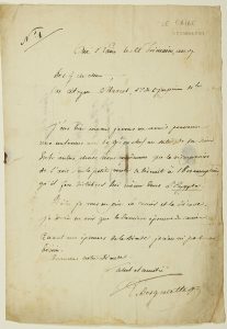 « J’eus hier comme je vous en avais prévenu une conférence avec le Général de Chef (BONAPARTE) au sortir de son diner entr’autres choses nous convînmes que la réimpression de l’Avis sur la petite vérole se tirerait à 1800 exemplaires, qu’il fera distribuer lui même dans l’Egypte. Hâtez je vous prie « le Courier de la Décade » (« LE COURIER DE L’EGYPTE ») je désire ne voir que la dernière épreuve de l’Avis.