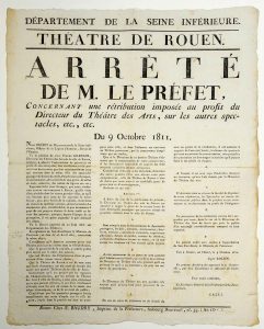 « Arrêté de M. le Préfet, concernant une rétribution imposée au profit du Directeur du Théâtre des Arts (de Rouen), sur les autres spectacles, etc. etc. du 9 Oct. 1811. » Impr. à ROUEN chez F. Baudry, Imprimeur de la Préfecture, faubourg Bouvreuil, N°33 ; 1811 –