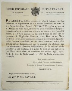 « Par Arrêt de la Cour d’assises impériale séant à SAINTES, en date du 13 Novembre 1811, Jean GAUTHIER, âgé de 35 ans, né à l’Abbaye de Pleine-Sève, de SALIGNAC, convaincu d’avoir commis une tentative de meurtre, avec préméditation sur les sœurs COTTREAU, dans leur maison, à d’AGUDELLE (17), a été condamné à la peine de mort et aux frais de procédure envers l’État… » -