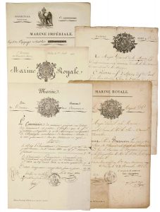 ─ Certificat pour un chirurgien auxiliaire qui a été embarqué sur le Brig L’INCONSTANT Commandé par M. DU PETIT-THOUARS en 1823 et sur la Canonnière L’ARQUEBUSE 1824. Pièce signée du Commissaire de Marine, préposé aux détails des armements et Prises. Toulon 1824 (Vignette Marine)