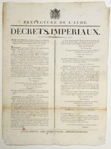 « Préfecture de l’AUDE. DÉCRETS IMPÉRIAUX. A LYON le 13 Mars 1815. Décret impérial qui ordonne d’apposer le séquestre sur les biens des princes de la Maison des BOURBON, et rapporte les lois qui rendaient les biens des émigrés…