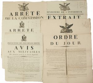 ─ « Arrêté du Préfet des Bouches-du-Rhône FROCHOT, fait à MARSEILLE le 19 Mai 1815. «qui ordonne la réimpression des principales dispositions des lois relative à l’Embauchage et à la provocation à la désertion. » (45 x 36)