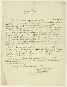 “AU NOM DU ROY. M. De KEROUAR Adjudant Général de mon Armée se rendra à VIEILLEVIGNE (44) auprès de M. LE MAGNAU Chef de cette Division. Il lui communiquera les avis que nous avons reçu sur la marche projetée de l’Ennemi afin que M. Le MAGNAU les transmette à M. le Comte DU CHAFFAULT (Jacques Gabriel; Général Vendéen) .