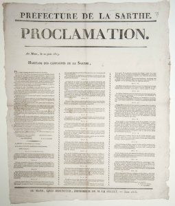 PROCLAMATION et Arrêté des Autorités commandant le Département de LA SARTHE, au MANS le 20 Juin 1815.