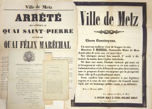 ─ Affiche (62 x 46). « Ville de METZ. Chers Concitoyen. Un nouveau malheur vient de frappé la cité. Monsieur F. MARÉCHAL, l’honorable Maire de METZ depuis plus de 16 ans, est mort hier ! ...