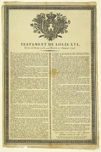 TESTAMENT DE LOUIS XVI, né le 23 Août 1754, mort le 21 Janvier 1793. Fait à la Tour du temple le 25 décembre 1792. Dernières paroles : « Je pardonne à mes ennemis ; je désire que ma mort fasse le salut de la France : je meurs innocent. »...