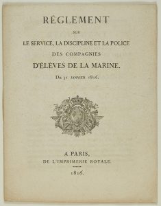 MARINE - “RÈGLEMENT sur le Service, la Discipline et la Police des Compagnies d’ÉLÈVES DE LA MARINE.” du 31 Janvier 1816 - Impr. à PARIS, de l‘Imprimerie royale, 1816; 19pp in-4° -
