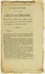 CHATEAUBRIAND (François René, Vicomte de) Saint Malo 1768 – Paris 1848 – Écrivain, Ambassadeur et Ministre des Affaires Etrangères. – « DISCOURS de M. le Vicomte CHATEAUBRIAND, Pair de France, Ministre des affaires étrangères, prononcé...