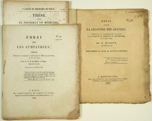 ─ 1823. « Essai sur la Ligature des artères ; présenté et publiquement soutenu à la Faculté de Médecine de MONTPELLIER, le 5 Août 1823 ; par P. MASSOT de Perpignan, pour obtenir le grade de Docteur en Médecine. Impr. à Montpellier, chez Jean MARTEL ainé, Seul Imprimeur de la Faculté de Médecine, près l’Hôtel de la préfecture, N°62, 1823 ; 47pp in-4°, avec envoi autographe « P. Massot. »