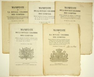 ─ « Manifeste de la royale Chambre des Comptes portant notification de quelques modifications faites par Sa Majesté au règlement sur la garantie des ouvrages d’or et d’argent.