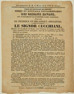 Le Signor CUCCHIANI, Membre de l’académie de Rome donnera dans cette Ville trois représentations seulement, tant de ses expériences que de l’habileté de ses oiseaux.