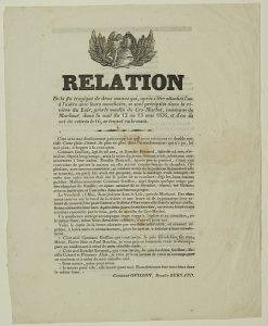 « Relation de la fin tragique de deux amants qui, après s’être attachés l’un à l’autre avec leurs mouchoirs, se sont précipités dans la rivière du Loir, près le moulin du CRO-MARBOT, commune de MARBOUÉ, dans la nuit du 12 au 13 mai 1836, et d’où ils ont été retirés le 16, se tenant embrassés. Complainte à ce sujet… ».