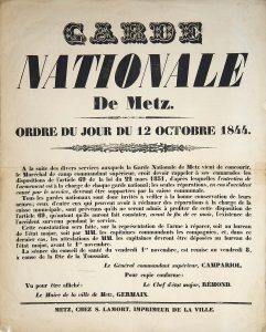 « A la suite des divers services auxquels la Garde Nationale de METZ vient de concourir, le Maréchal de Camp commandant supérieur croit devoir rappeler à ses camarades… que l’entretien de l’armement est à la charge de chaque Garde National; les seules réparations, en cas d’accident causé par le service, devront être supportées par la caisse communale. Tous les Gardes Nationaux sont donc invités à veiller à la bonne conservation de leurs armes… »