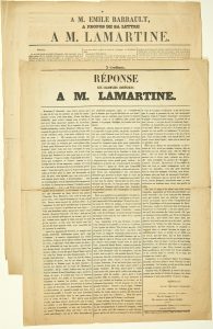1) Adresse d’Alexandre DUMAS : “à M. Émile BARRAULT, à propos de sa Lettre à Mr LAMARTINE.” - (juillet 1848) - Imprimerie de E. Brière, 55 rue Sainte-Anne - 2pp (33 x 45) -